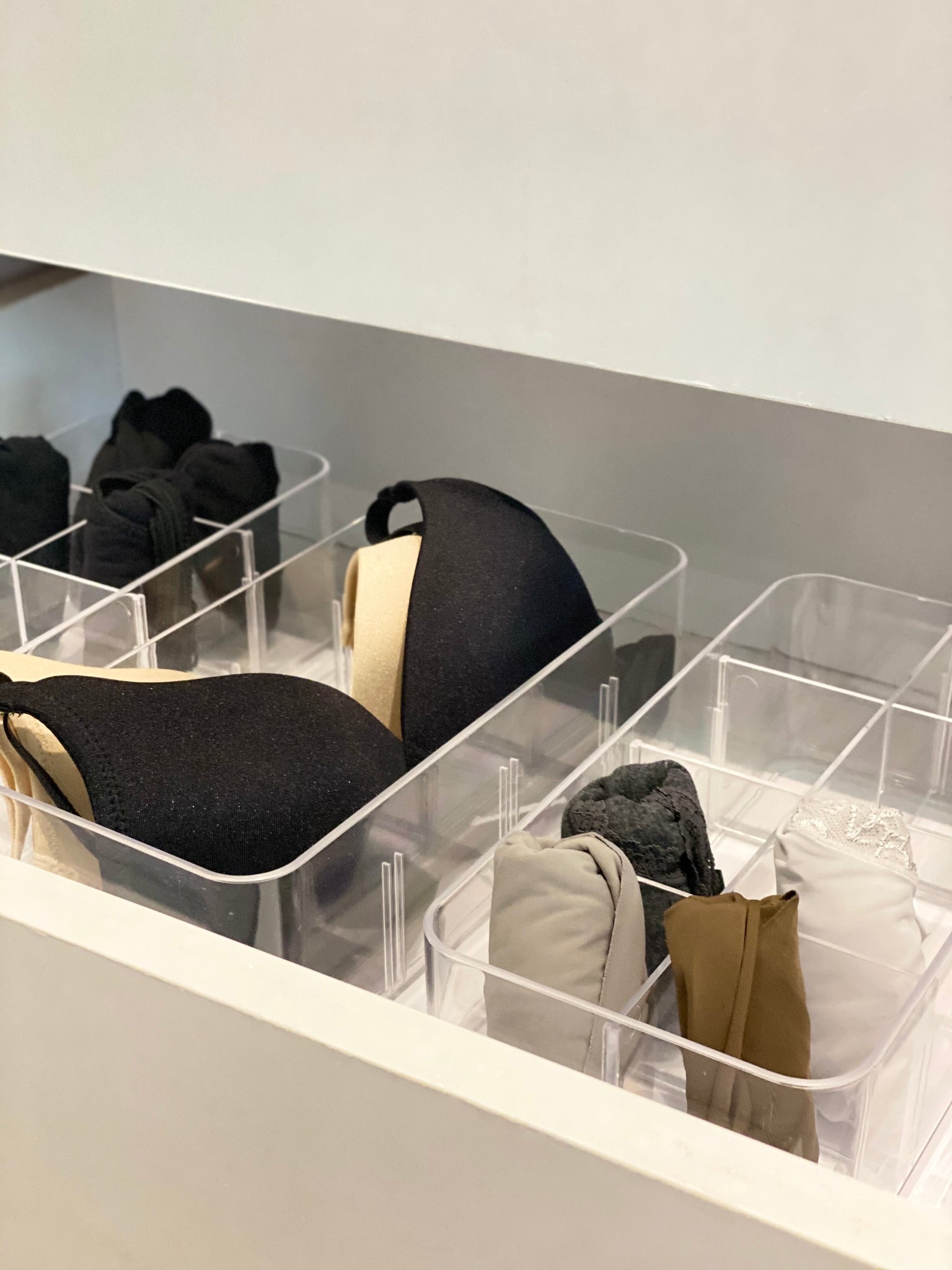 Features: 4-pc set (consisting of 2 pcs. with 8 compartments each and 2 pcs. with 4 compartments each; each compartment/divider is removable); Multi-purpose; Great for undies, bras, sports bras, socks, caps, face masks and so on.